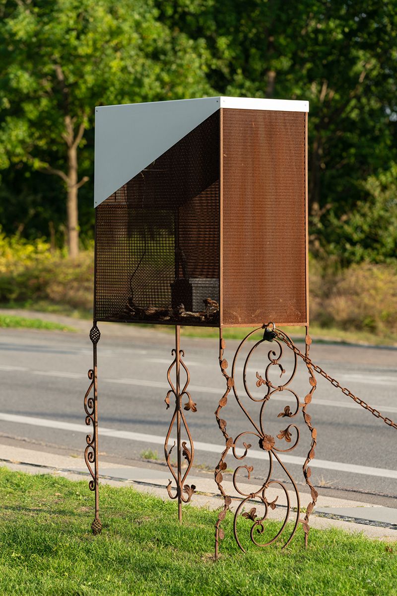 From the installation of the work in the museum garden. The artist placing dried animal parts inside of the installation's two cabinets.
